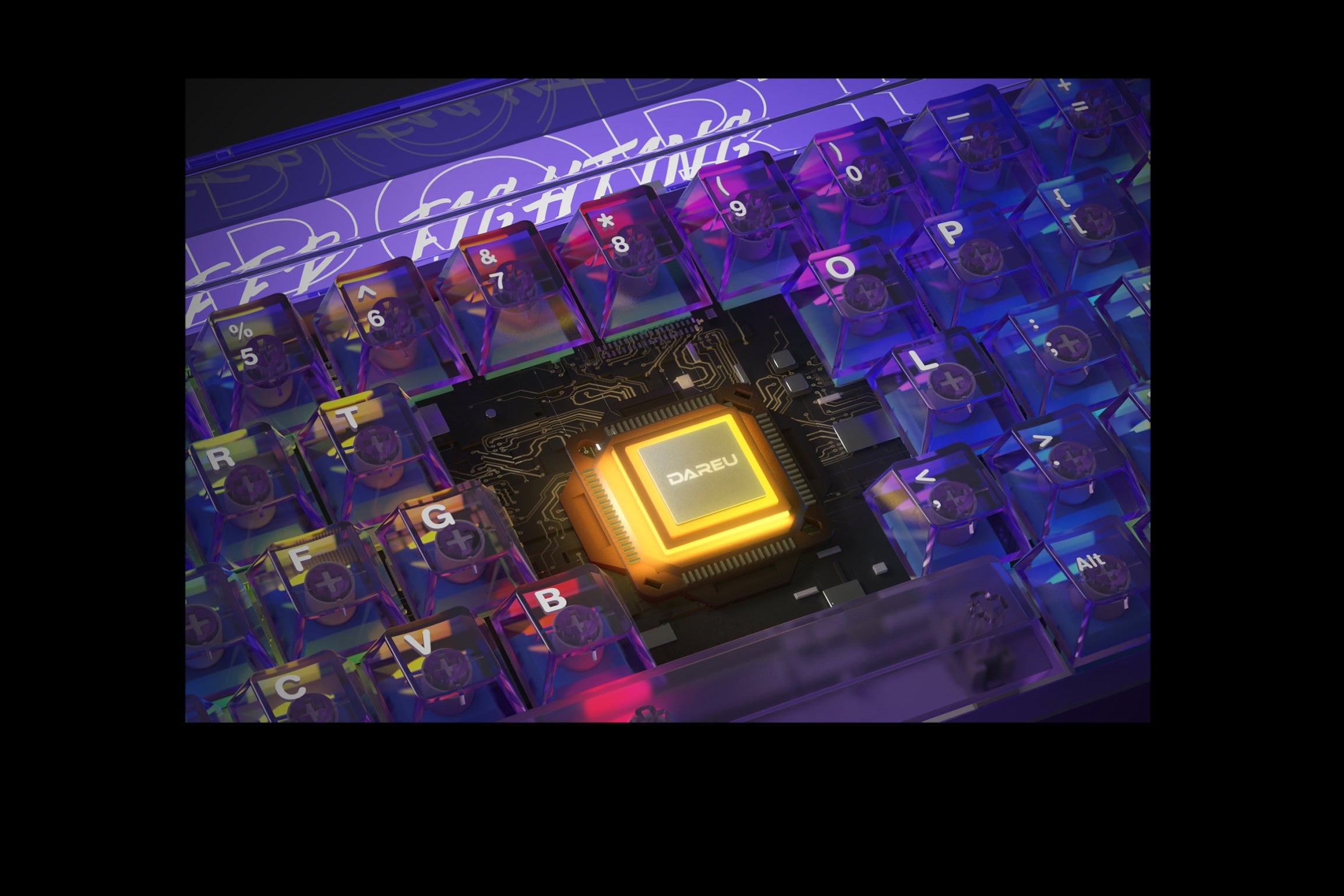 The DAREU Thunder 68 features a transparent 3D DIY light box, letting you create vivid RGB lighting while showcasing your favorite collectibles or mini toys. High on fun, personalization, and style, it turns your keyboard into a unique centerpiece.